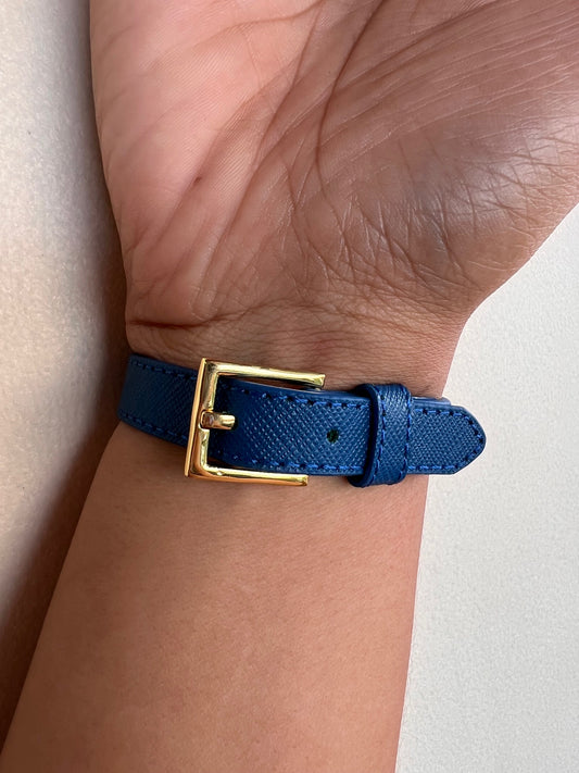 Brazalete Prada Cuerito Azul Logo Gold